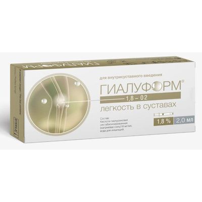 Hyaluform 1,8% – российский препарат содержащий гиалуроновую кислоту. Способствует эффекту замещения и восстановления синовиальной жидкости, купирует болезненые ощущения и трудность в передвижении из-за развития дегенеративных нарушений и травм связанных с коленными, тазовыми и других областей суставов. Для категории лиц с насыщенным образом жизни и постоянными нагрузками на больной сустав. Цена на Гиалуформ 1,8% для суставов указана на странице. Купить можно в интернет-магазине оптом и в розницу с доставкой в Москве и по регионам.